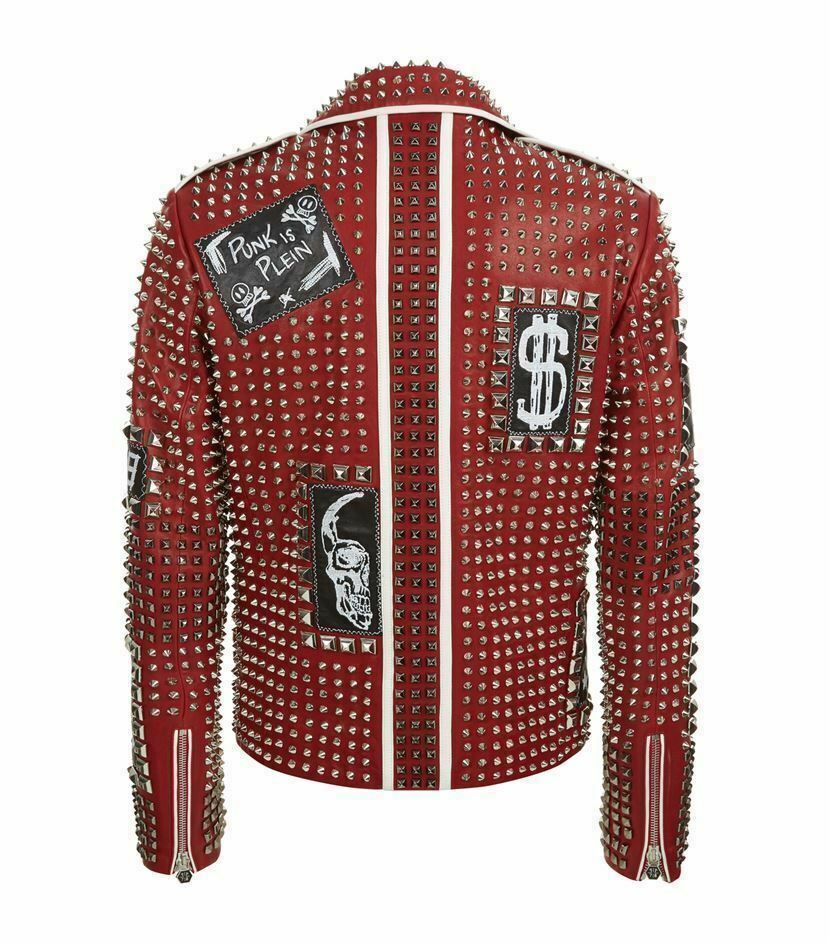 New Mens Handmade Jackets Silver Studs Fashion Red Cowhide Leather Motorcycle Jacket