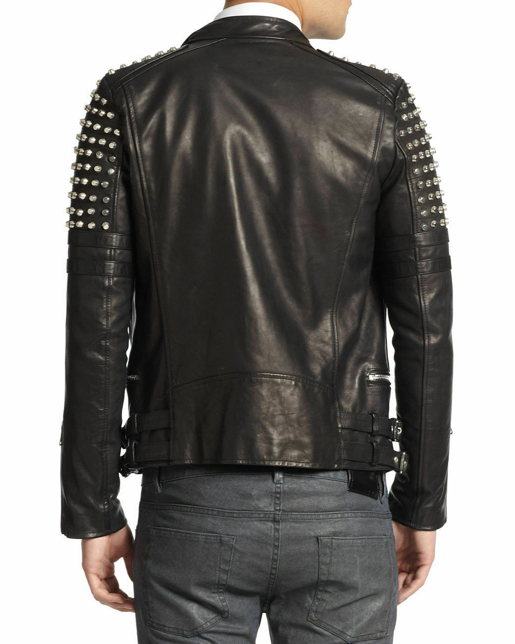 Man Handmade Jackets Studs Silver Cowhide Leather Vintage Motorcycle Jacket