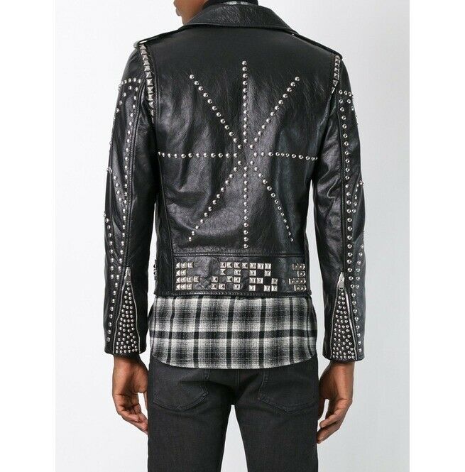Men Classic Sliver Studded Leather Motorcycle Jacket, Biker Leather Jacket