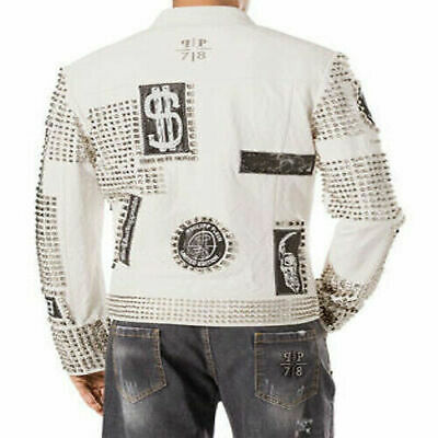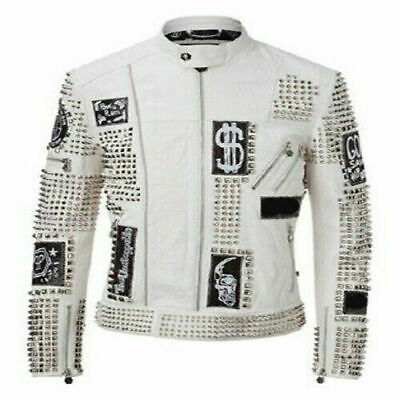 Men Bike Real Leather Jacket White Studded Embroidery Patches Leather jacket