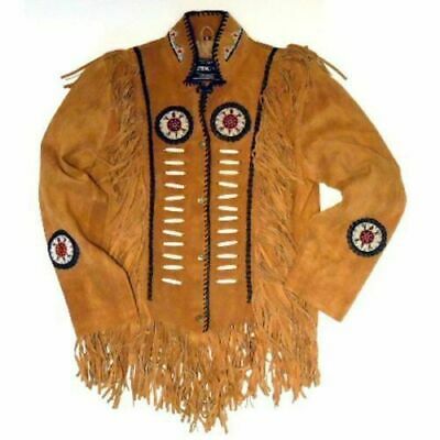New Men's Western Style Brown Suede Leather Jacket With Fringes Bone Beads