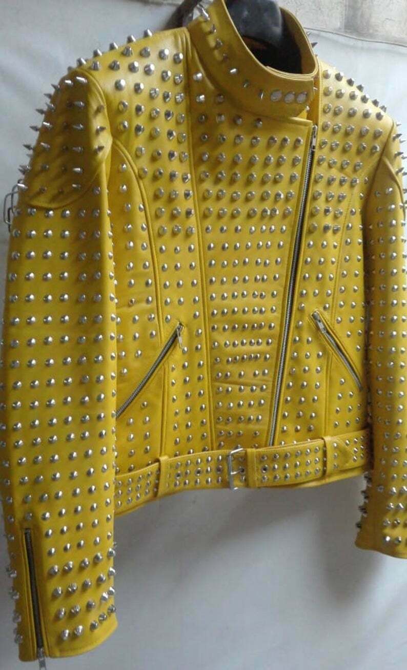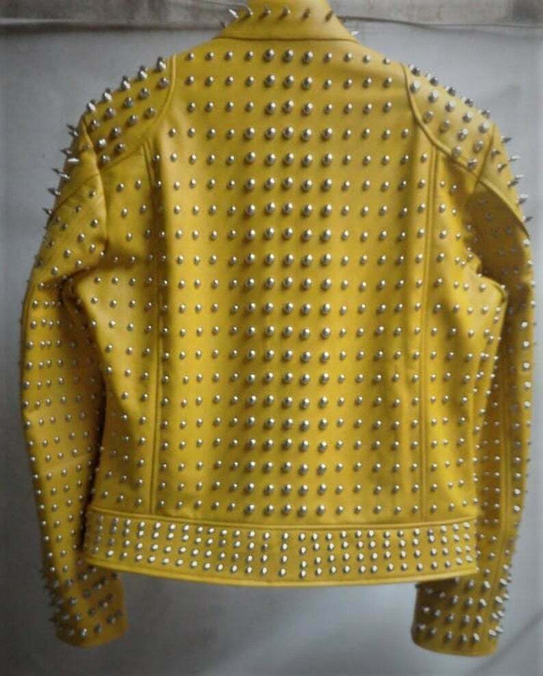 Yellow Studded Jacket Customized Handmade Biker Leather Jacket, Silver Spiked