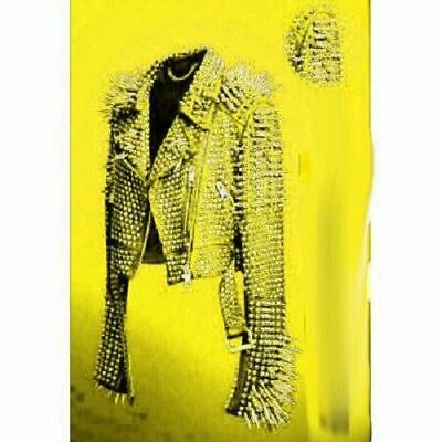 New Mens Full Yellow Punk Silver Long Spiked Studded Leather Brando Jacket