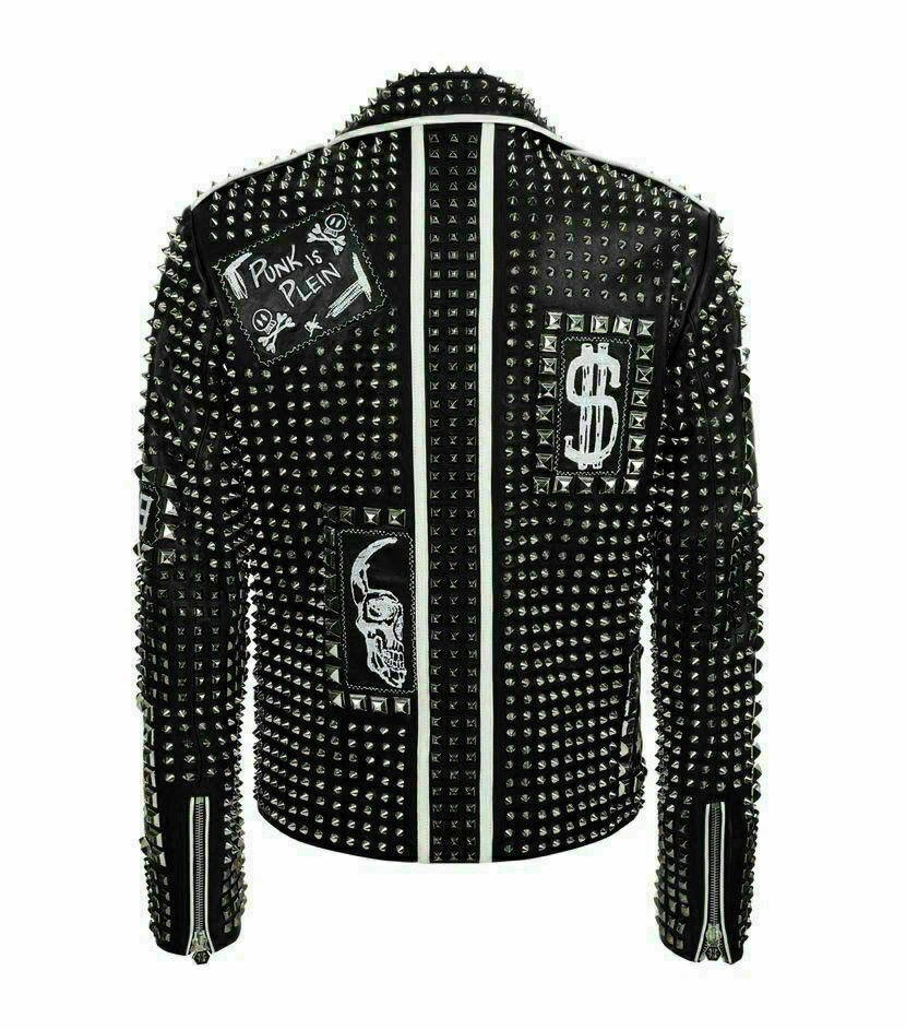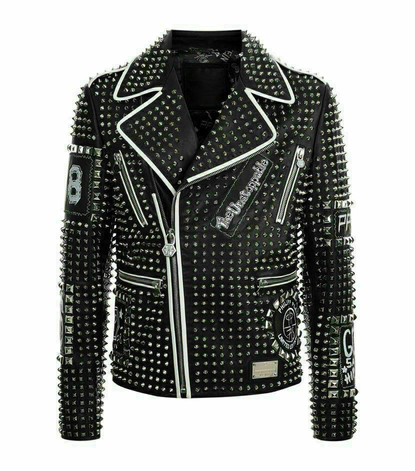 New Men's Philip Full Black Studded Punk Embroidery Patches Leather Jacket