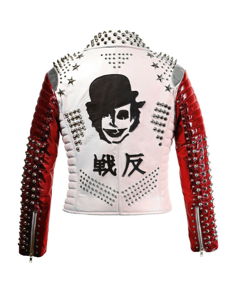 Two Tone White & Red Motor Biker Genuine Leather Jacket Full Silver Spike Studs