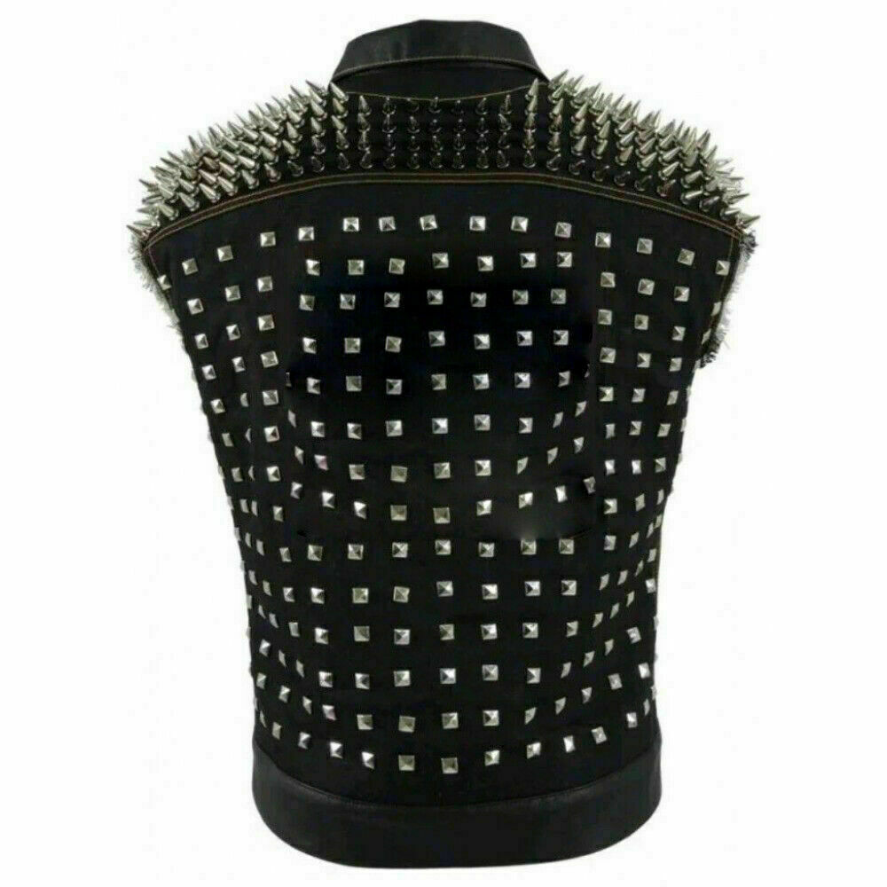 New Mens Black Full Silver Spiked Studded Punk Rock Cowhide Biker Leather Vest