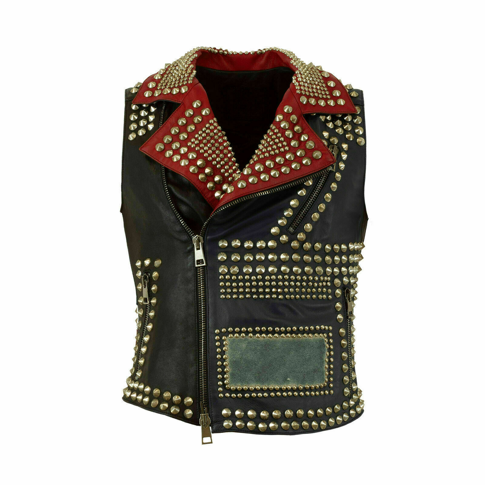 New Mens Black Red Silver Rivet Studded Punk Unique Cowhide Biker Leather Vest