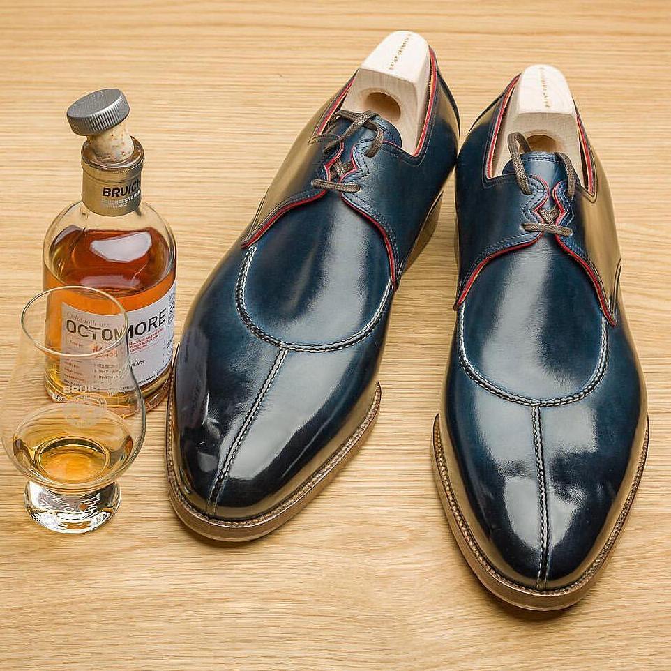Handmade Mens Derby with French Norwegian Apron Lace up Dark Blue Dress Shoes