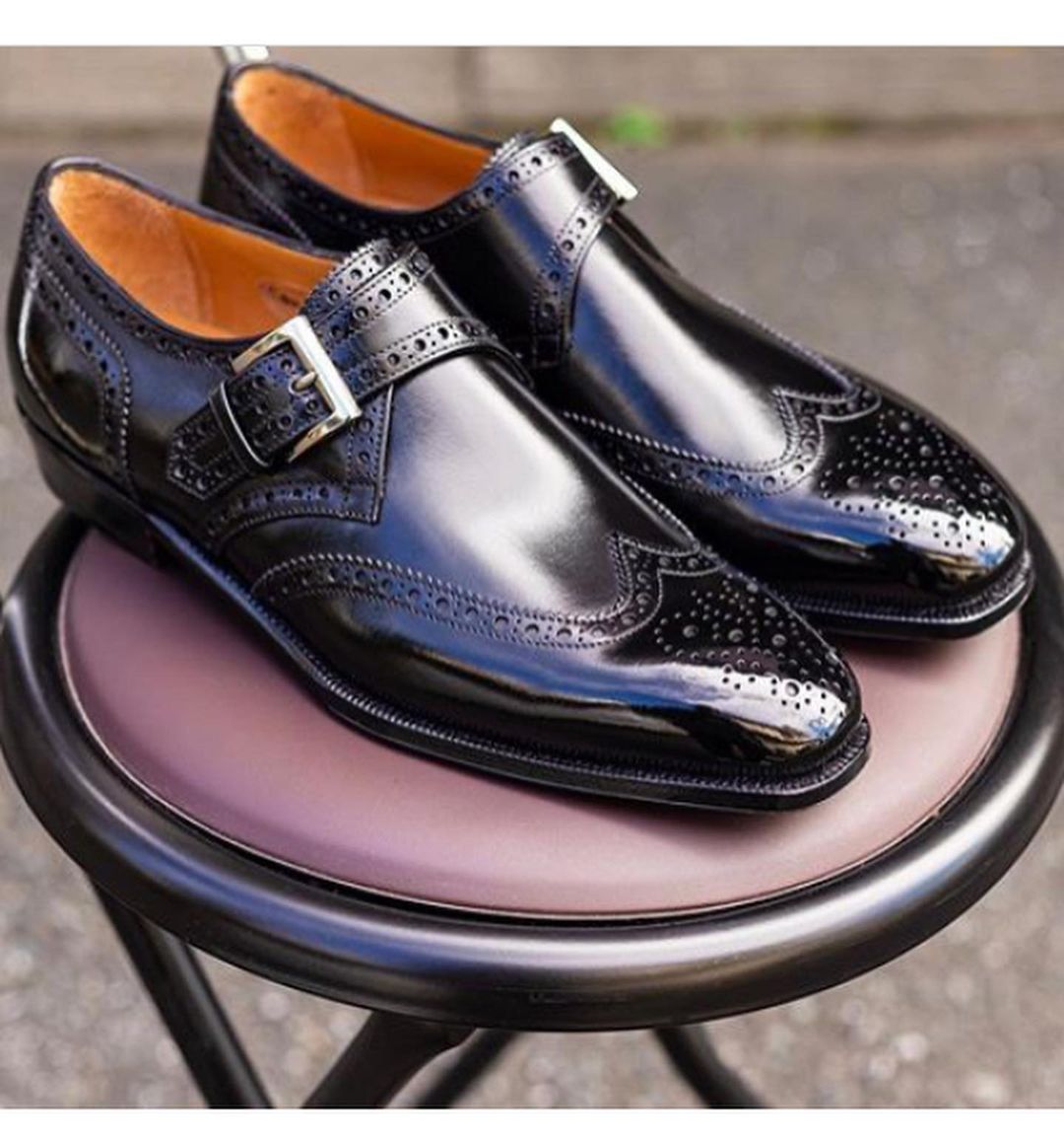 Handmade Black Leather Monk Strap Wingtip Dress Shoes