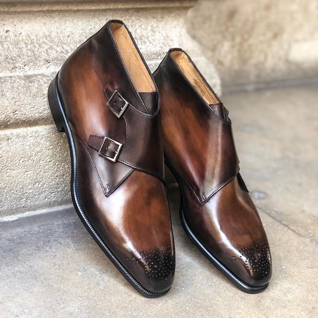 Double Monk Strap Ankle High Boots with a simple Dark Havana Patinated Leather