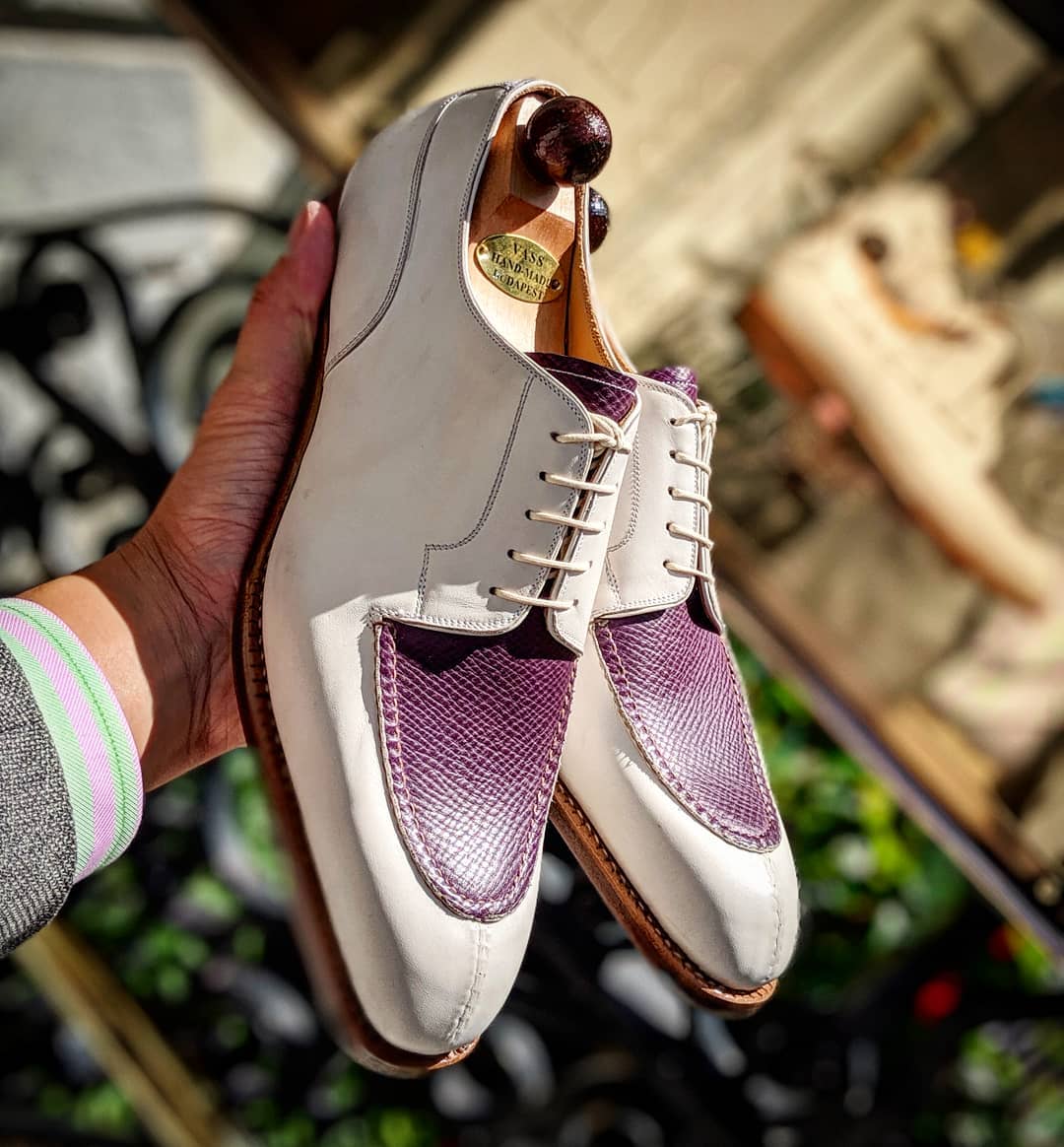 Inner: Soft Leather Sole: Leather Gender : Male Heel: Leather Color: White / Purple Style: Oxford Shoes Lining Soft Calf Leather Lining Totally Hand stitched Manufacturing time 7-10 business days If you can’t find your Size/Color just send us message we will make for you.