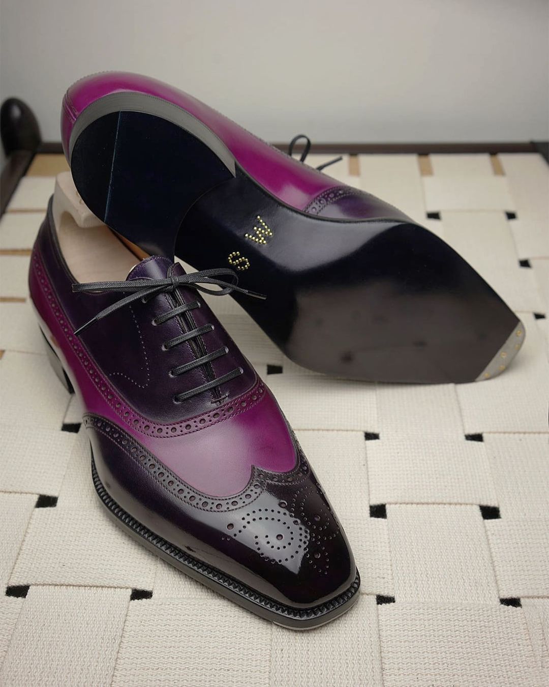 Inner: Soft Leather Sole: Leather Gender : Male Heel: Leather Color: Black / Purple Style: Oxford Wingtip Shoes Totally Hand stitched Manufacturing time 7-10 business days If you can’t find your Size/Color just send us message we will make for you.