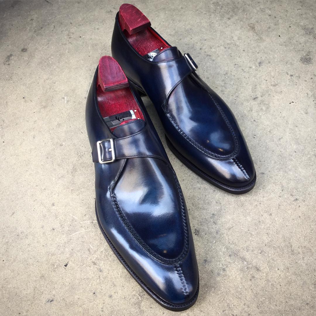 Handmade Mens Deep Blue Patina Monk Strap Shoes