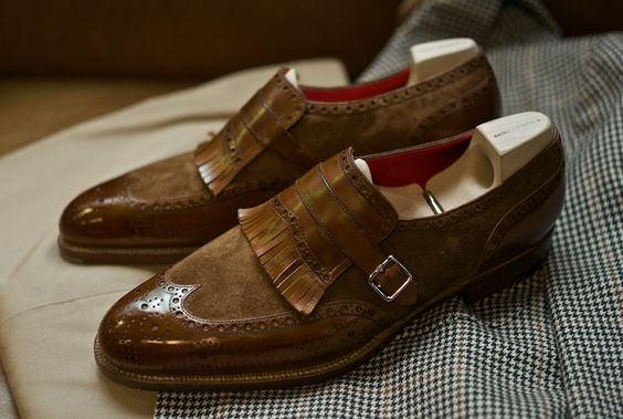 Two Tone Brown Suede Fringes Monk Strap Wingtip Shoes