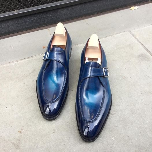Hamdmade Men Blue Patina Leather Monk Strap Dress Shoes