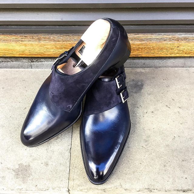 Made to Order Navy Blue Suede and Calf Leather Monk Strap Shoes