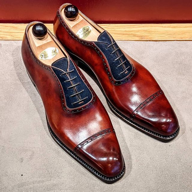 Italian-Oxford in Gold Museum Calf and Blue Suede Lace up Dress Shoes