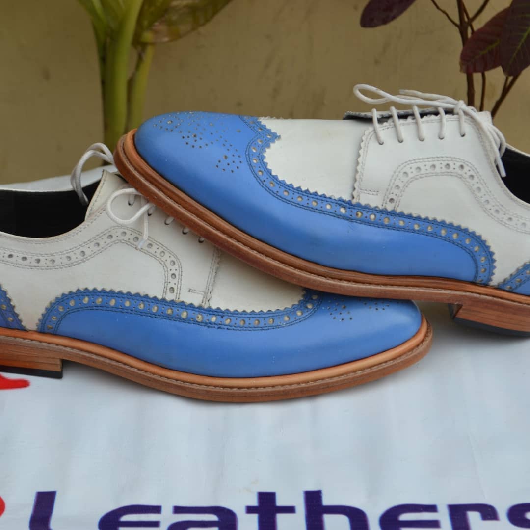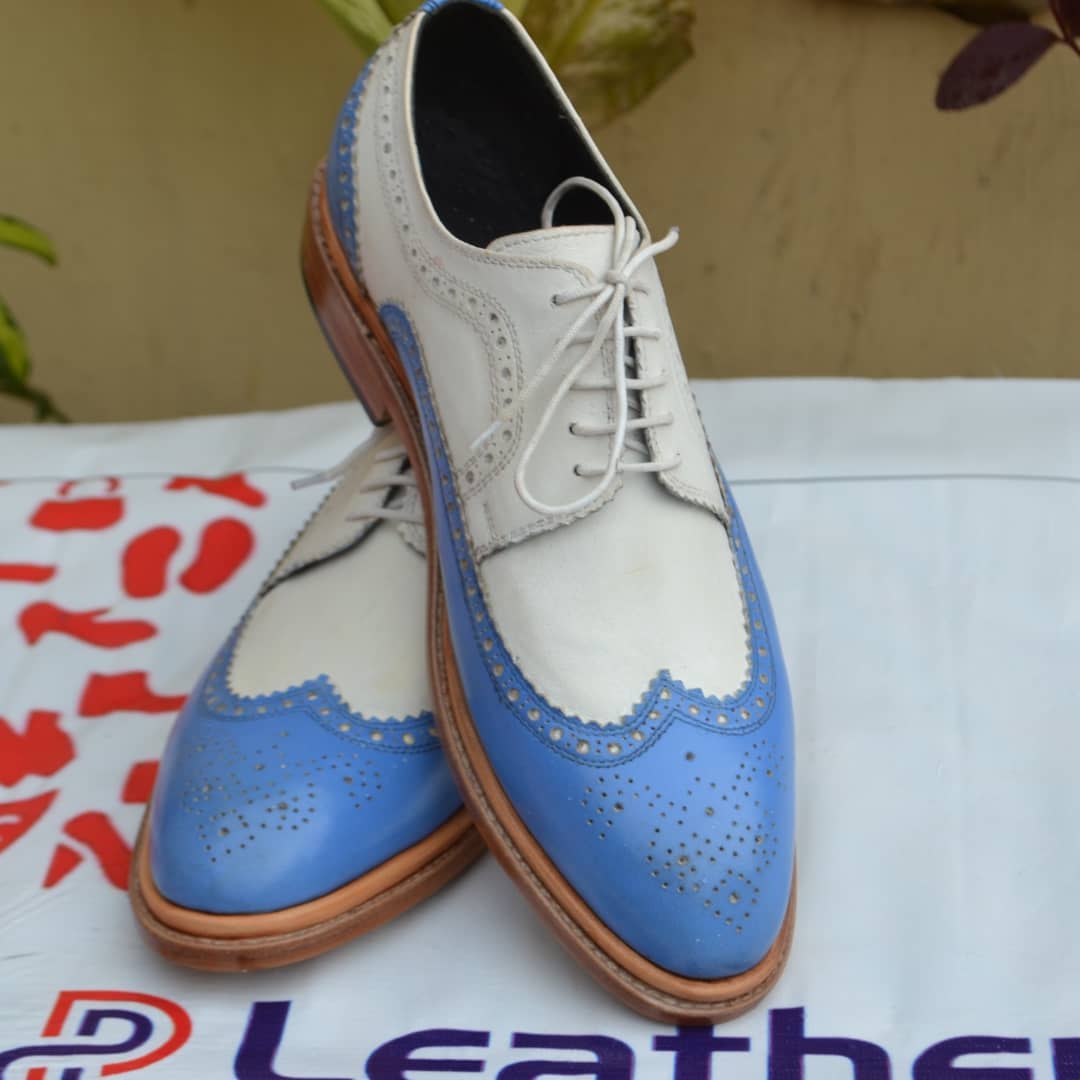 Handmade Blue White Leather Men Wingtip Oxford Dress Shoes
