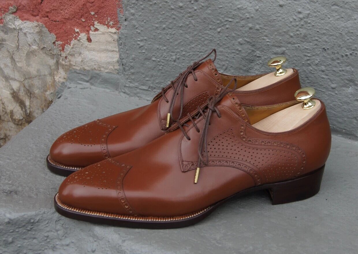 Inner: Soft Sole: Leather Gender : Male Heel: Leather Color: Brown Style: Wingtip Shoes Lining Soft Calf Leather Lining Totally Hand stitched Manufacturing time 7-10 business days If you can’t find your Size/Color just send us message we will make for you.