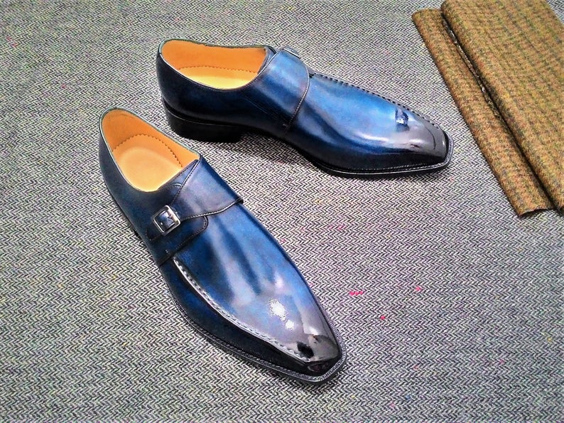 Inner: Soft Sole: Leather Gender : Male Heel: Leather Color: Blue Style: Monk Strap Shoes Lining Soft Calf Leather Lining Totally Hand stitched Manufacturing time 7-10 business days If you can’t find your Size/Color just send us message we will make for you.