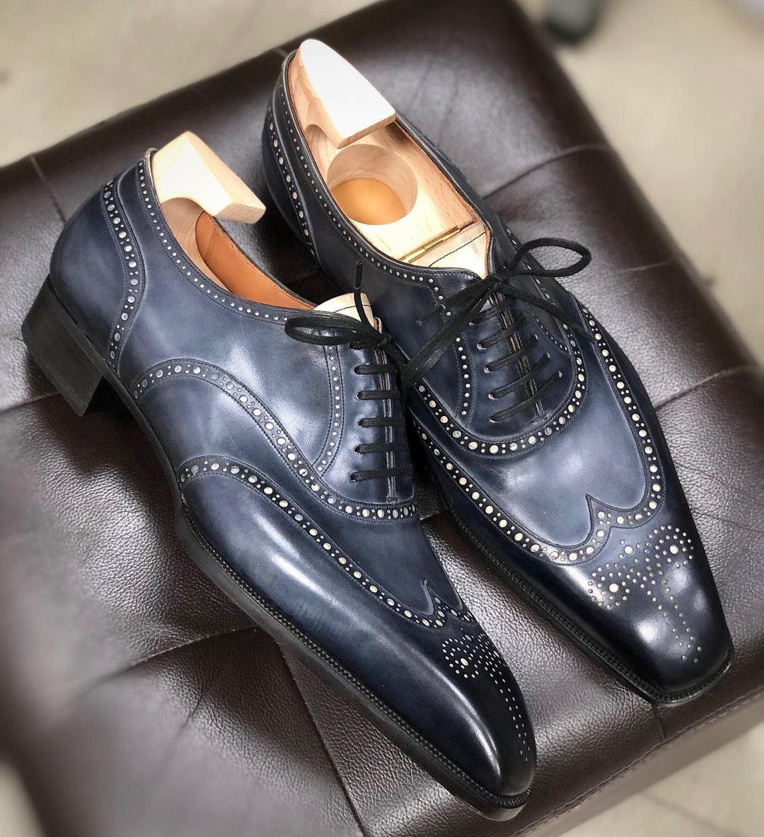 Handmade Mens Blue Patina Wingtip Oxford Dress Shoes