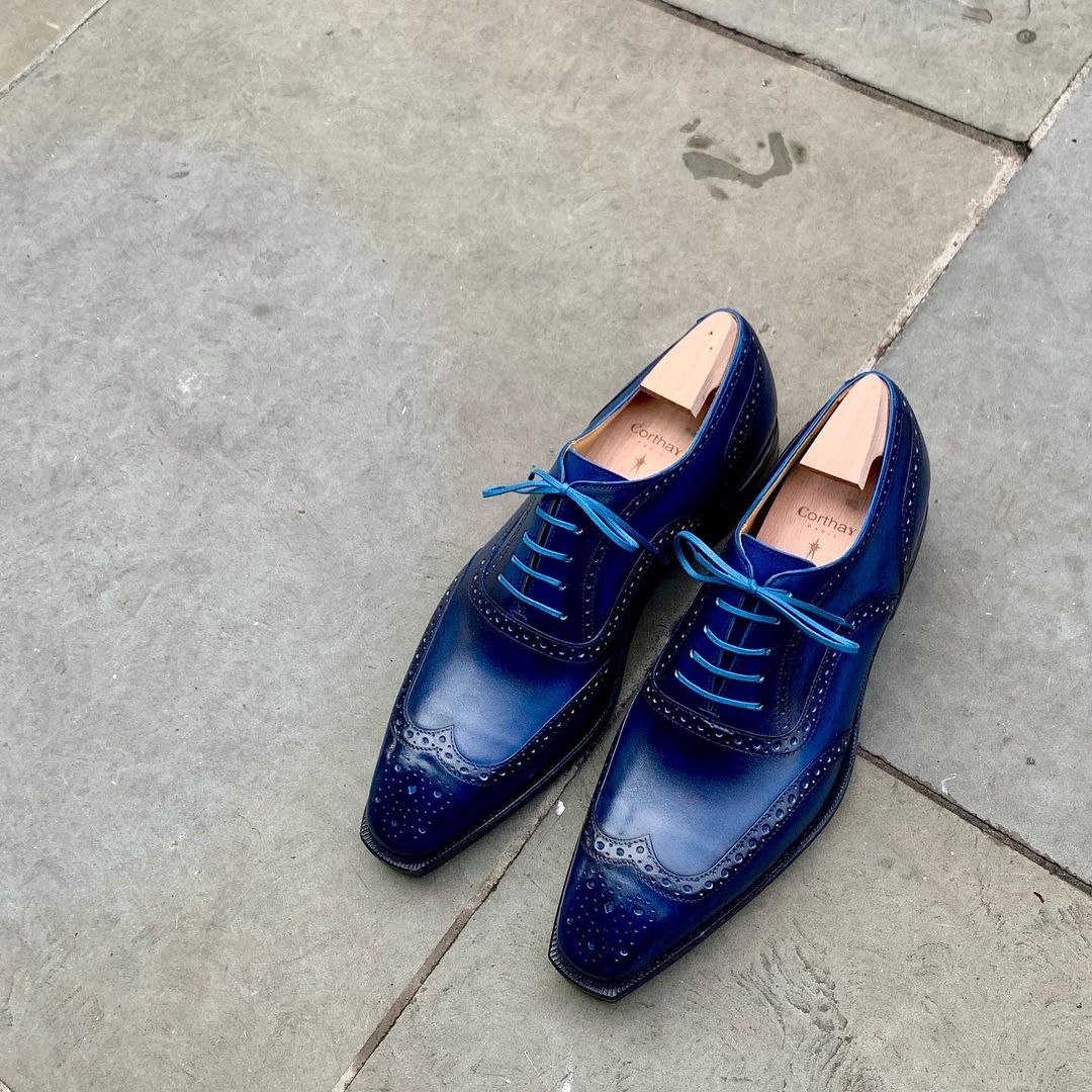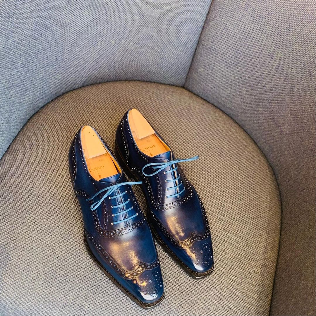 Inner: Soft Sole: Leather Gender : Male Heel: Leather Color: Dark Blue Navy Patina Style: Wingtip Shoes Totally Hand stitched Manufacturing time 7-10 business days If you can’t find your Size/Color just send us message we will make for you.
