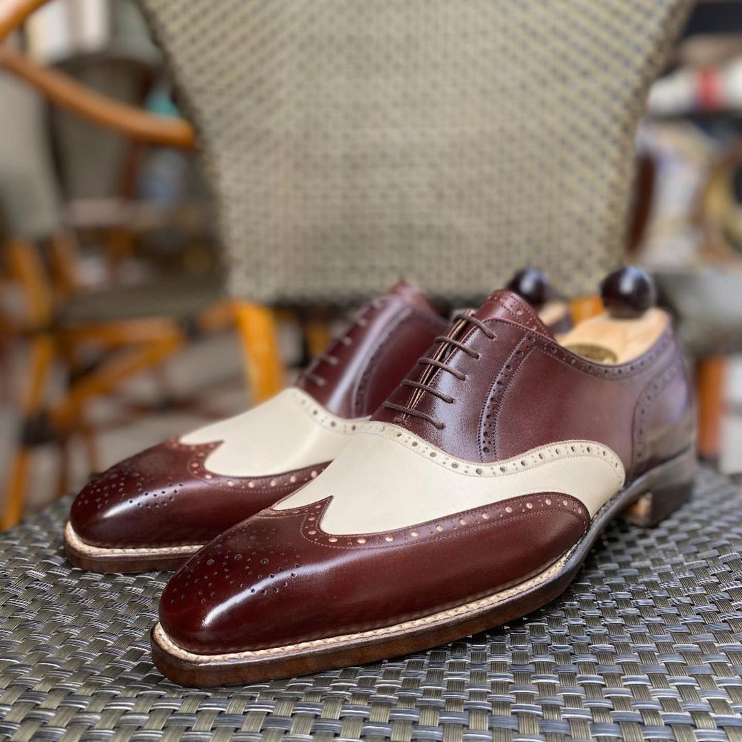 Handmade Men Brown White Oxford Wingtip Dress Lace up Shoes