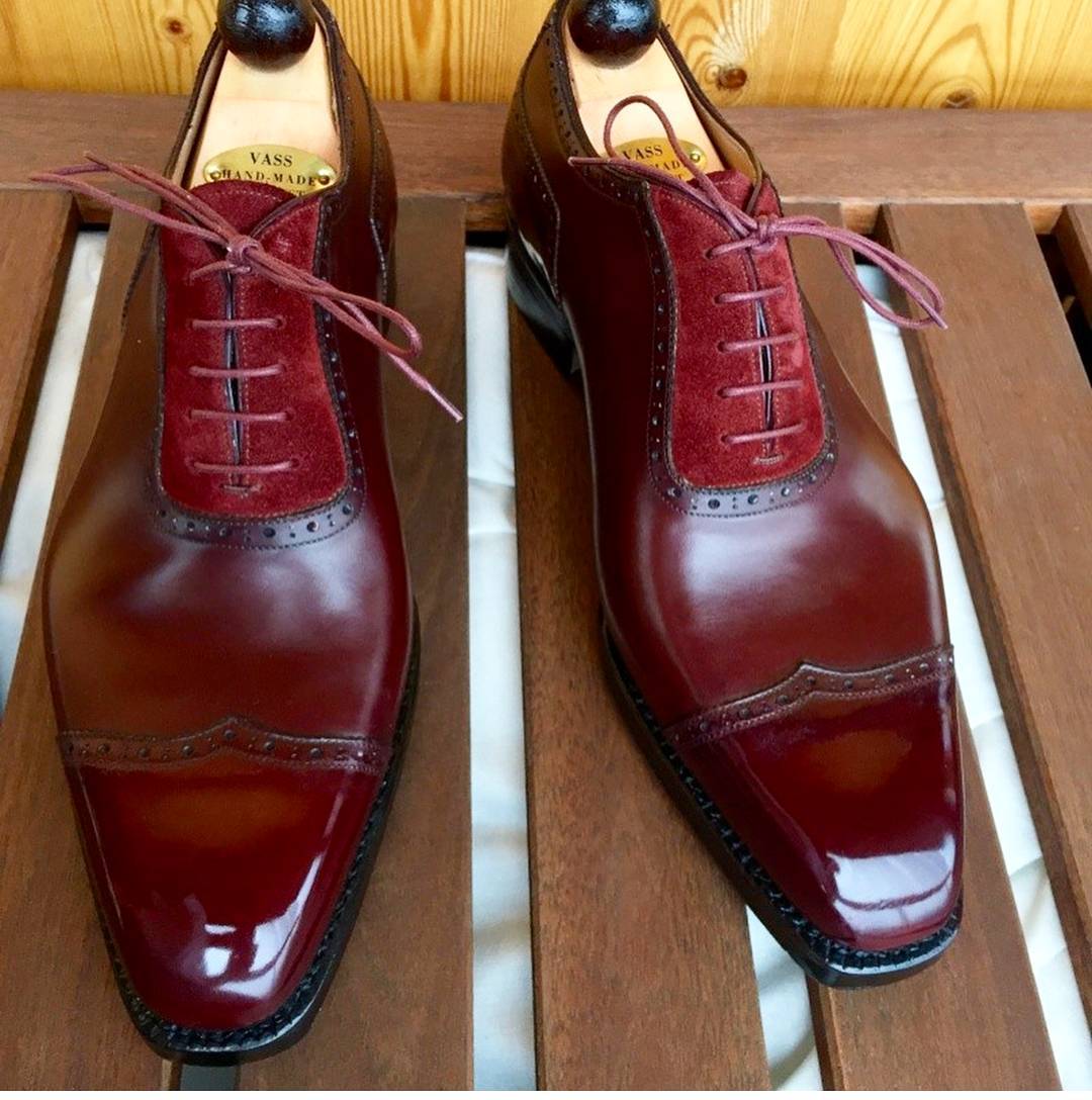 Handmade Men Oxford Deep Bordeaux Calf Suede Leather Wingtip Dress Shoes
