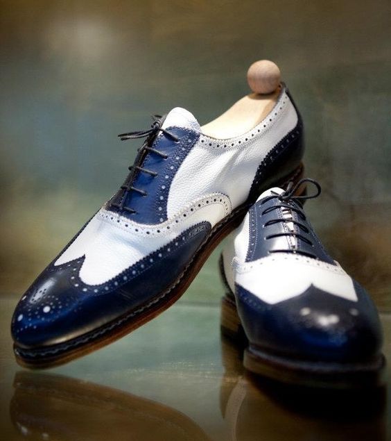 Handmade Mens Blue White Leather Oxfords Wingtip Formal Dress Shoes