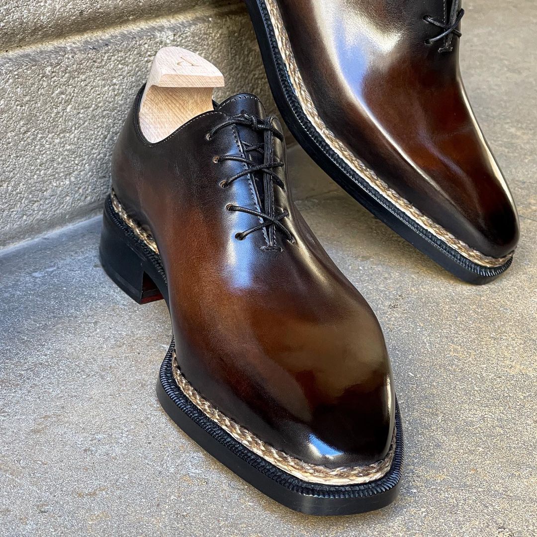 Inner: Soft Sole: Leather Gender : Male Heel: Leather Color: Chocolate Brown Patina Style: Dress Shoes Totally Hand stitched Manufacturing time 7-10 business days If you can’t find your Size/Color just send us message we will make for you.