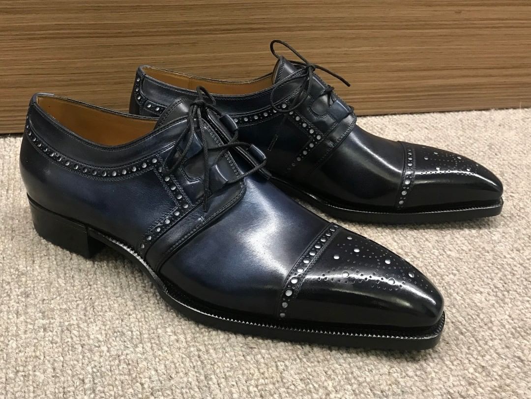 Inner: Soft Sole: Leather Gender : Male Heel: Leather Color: Blue / White Style: Dress Shoes Lining Soft Calf Leather Lining Totally Hand stitched Manufacturing time 7-10 business days If you can’t find your Size/Color just send us message we will make for you.