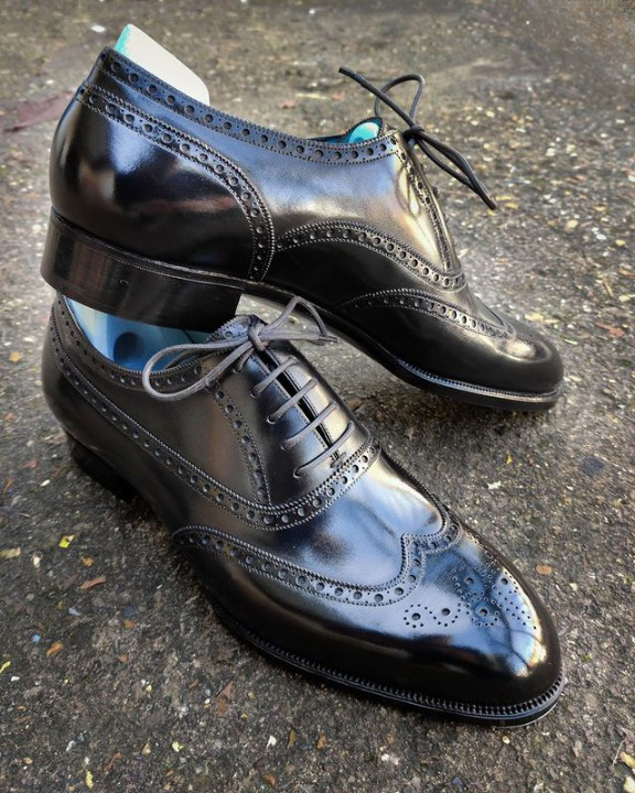 Bespoke Asymmetrical Brogue Oxford Black Calf Leather Wingtip Dress Shoes