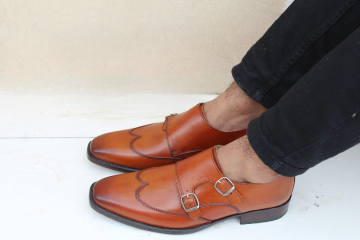 Handmade Brown Double Monk Strap Wingtip Shoes
