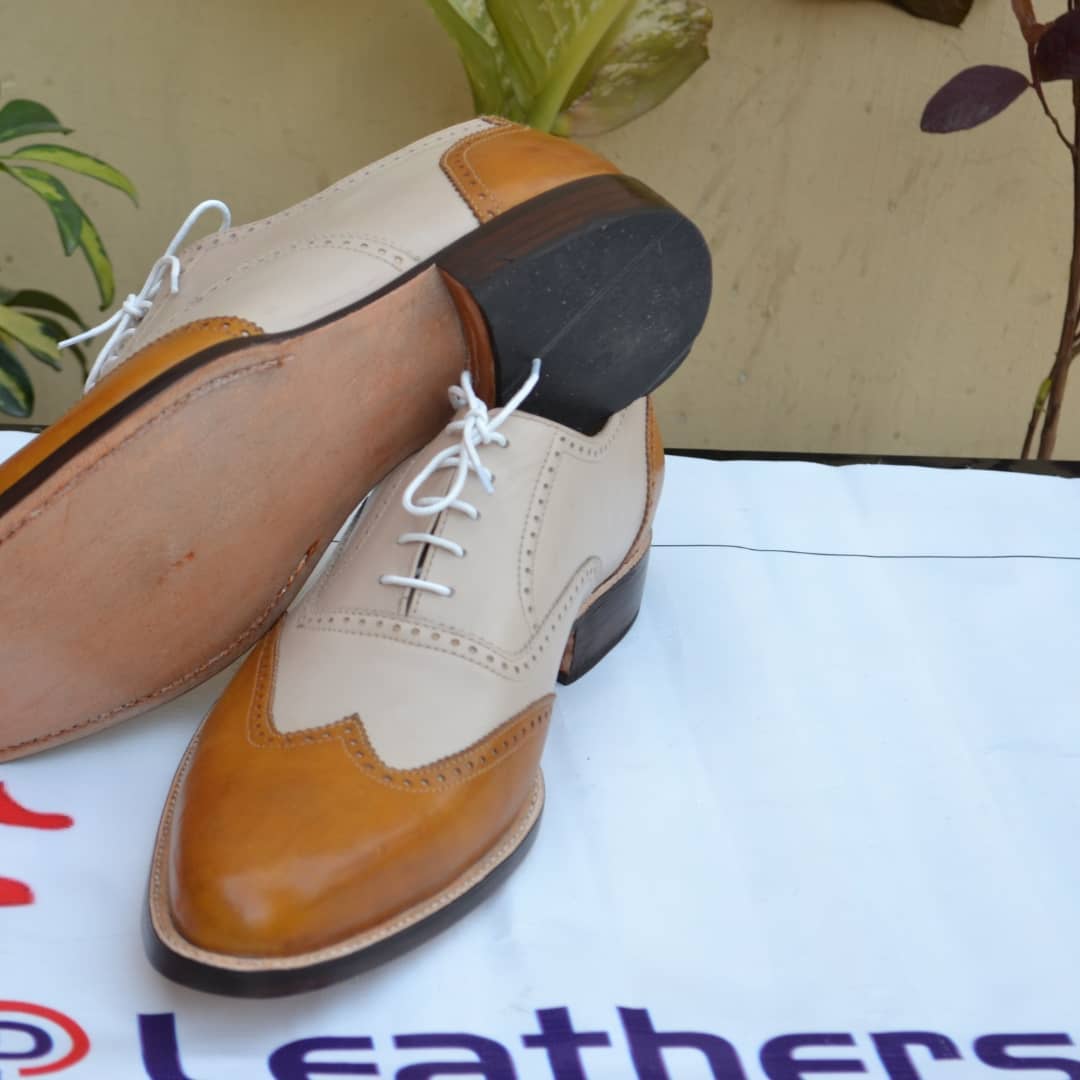 Bespoke Handmade Classic Men Brown Beige Leather Wingtip Oxford Dress Shoes