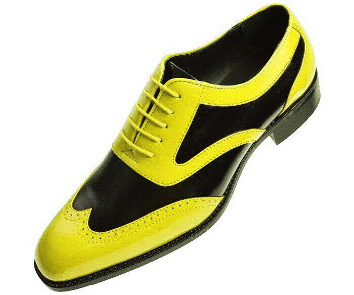 Men's New Item Yellow Black Contrast Wing Tip Derby Toe Genuine Leather Dress Shoes