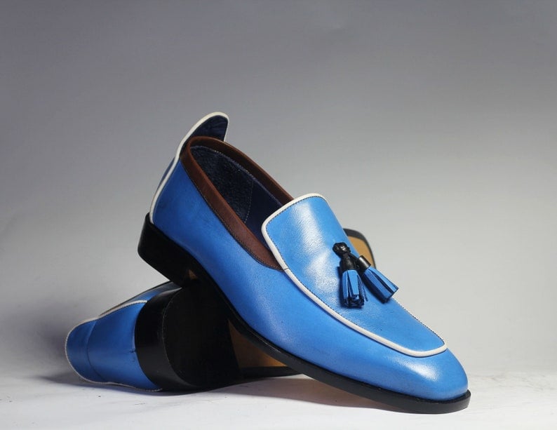 Inner: Soft Sole: Leather Gender : Male Heel: Leather Color: Blue Style: Tassel Loafers Shoes Lining Soft Calf Leather Lining Totally Hand stitched Manufacturing time 7-10 business days If you can’t find your Size/Color just send us message we will make for you.