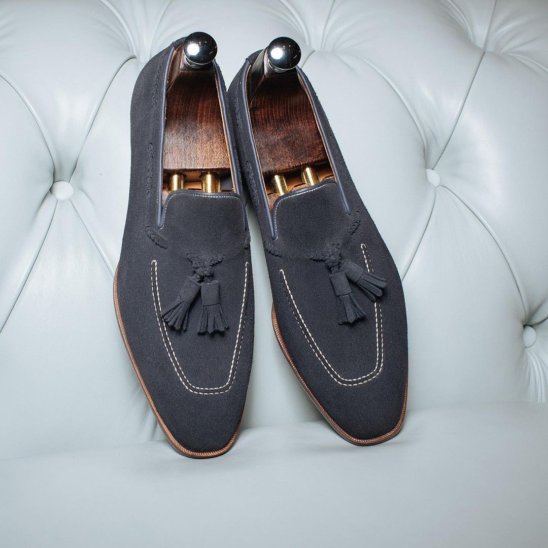 Handmade Men Gray Suede Leather Tassel Loafers Shoes