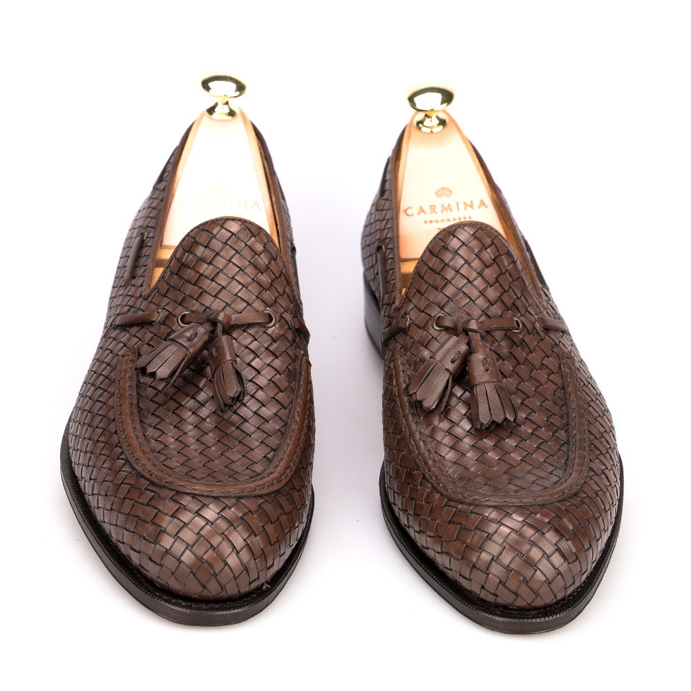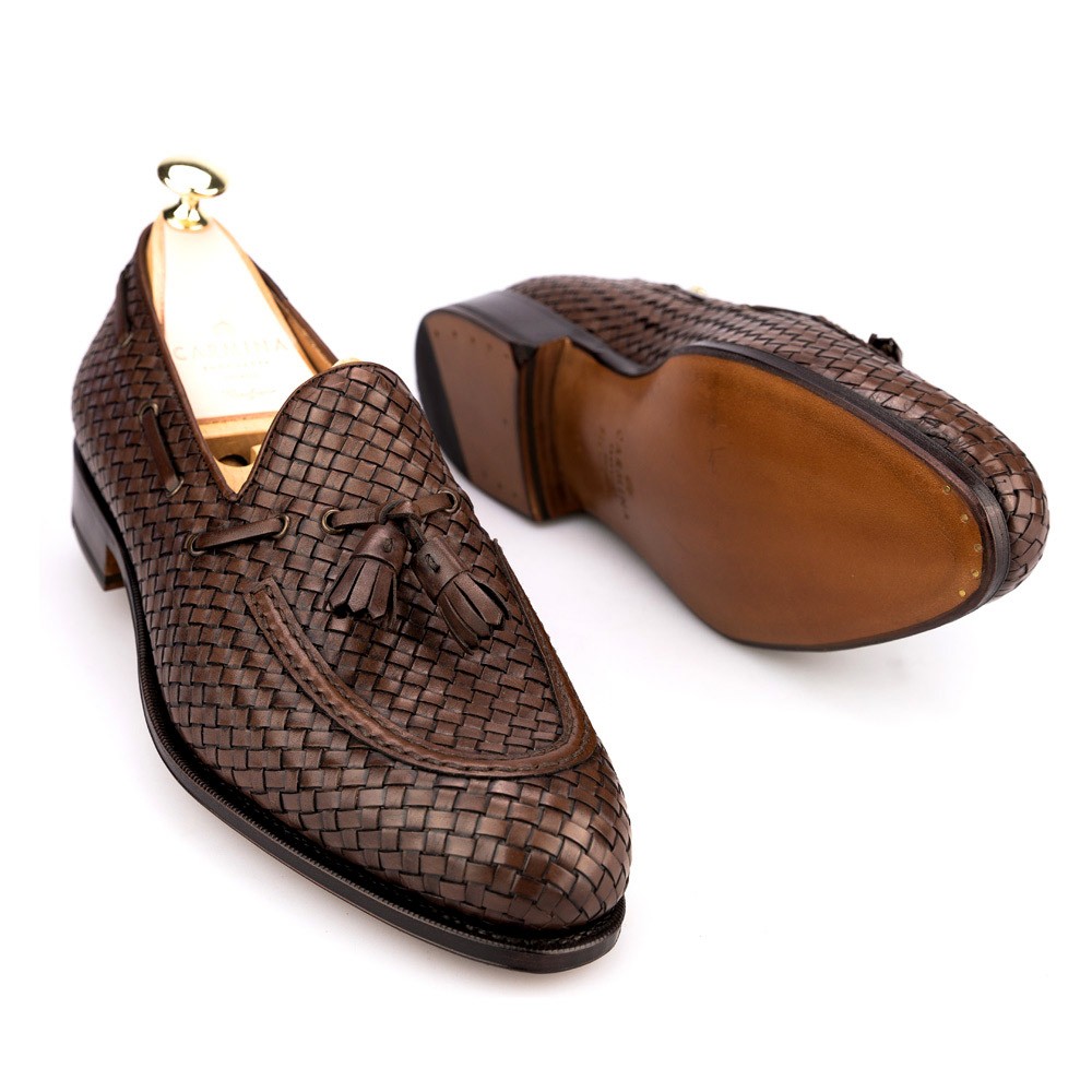 Men Handmade Woven Leather Tassel Loafers Dress Shoes in Brown