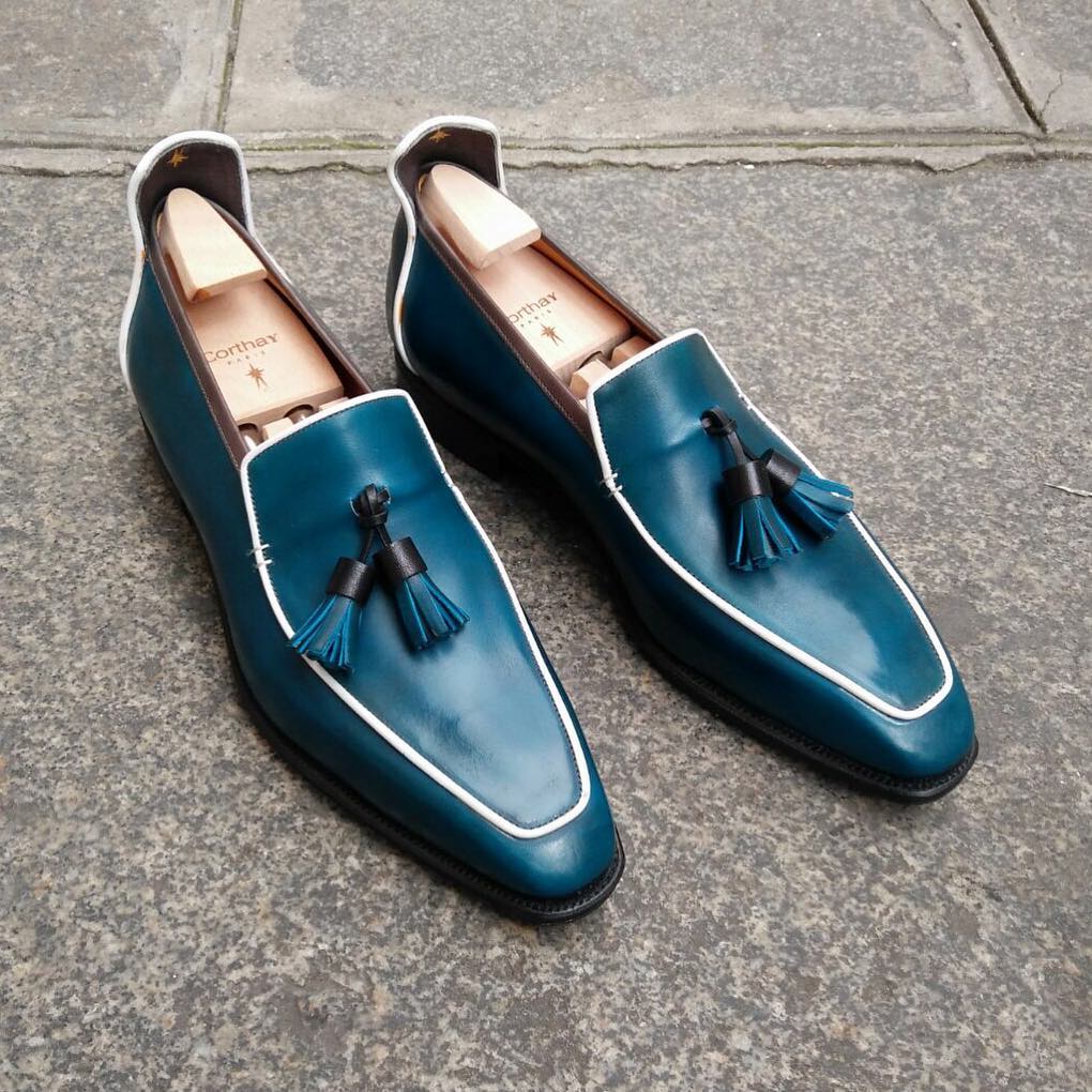 Inner: Soft Sole: Leather Gender : Male Heel: Leather Color: Blue Patina Style: Tassel Loafers Shoes Lining Soft Calf Leather Lining Totally Hand stitched Manufacturing time 7-10 business days If you can’t find your Size/Color just send us message we will make for you.