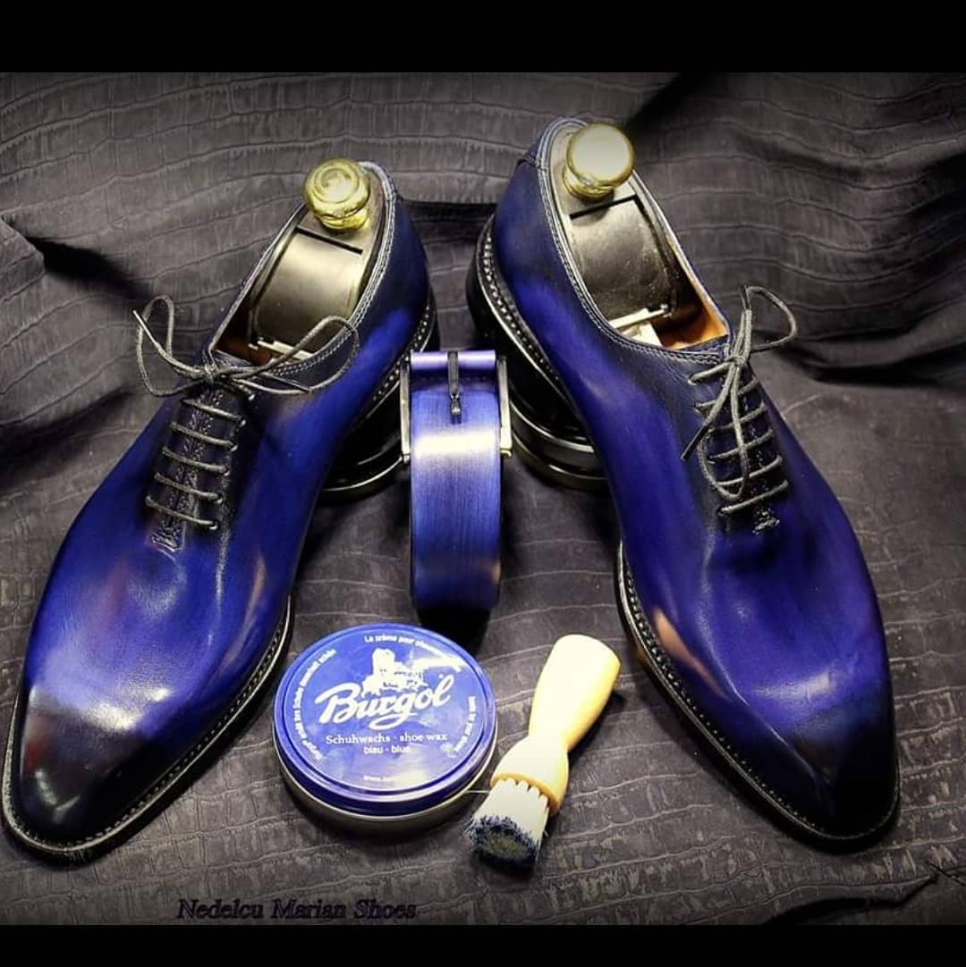 Blue Genuine Leather Oxford Dress Lace up Shoes wiih Matching Belt