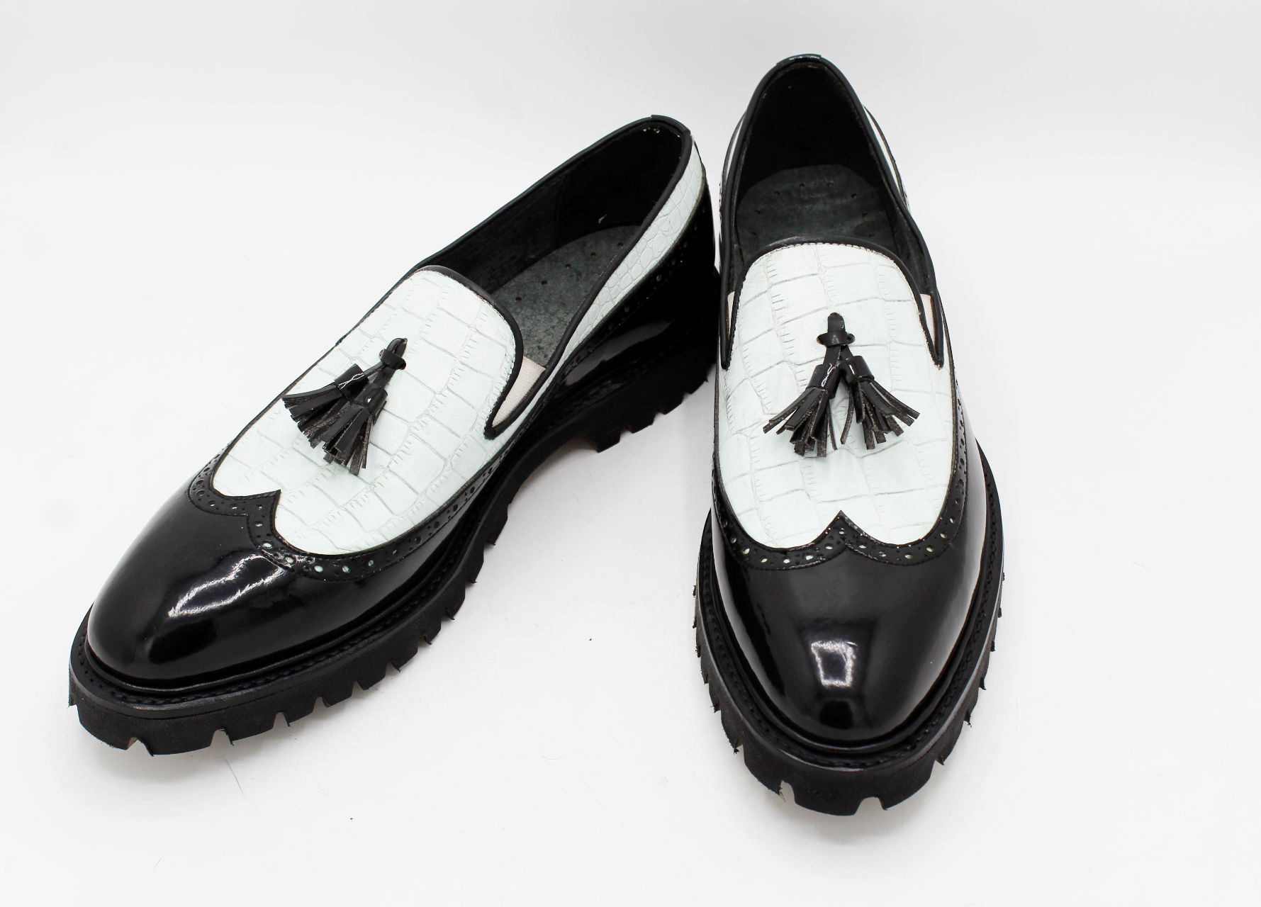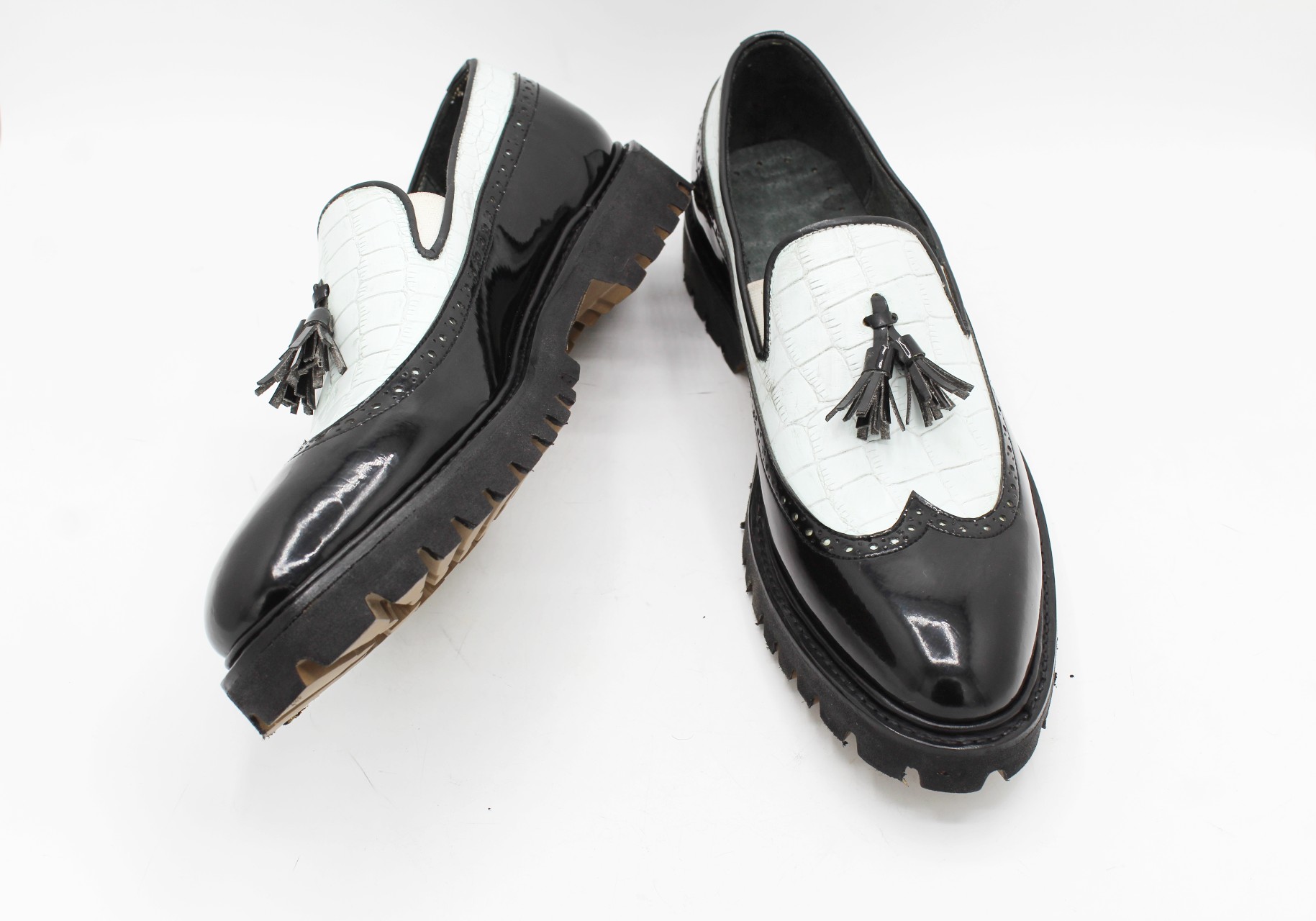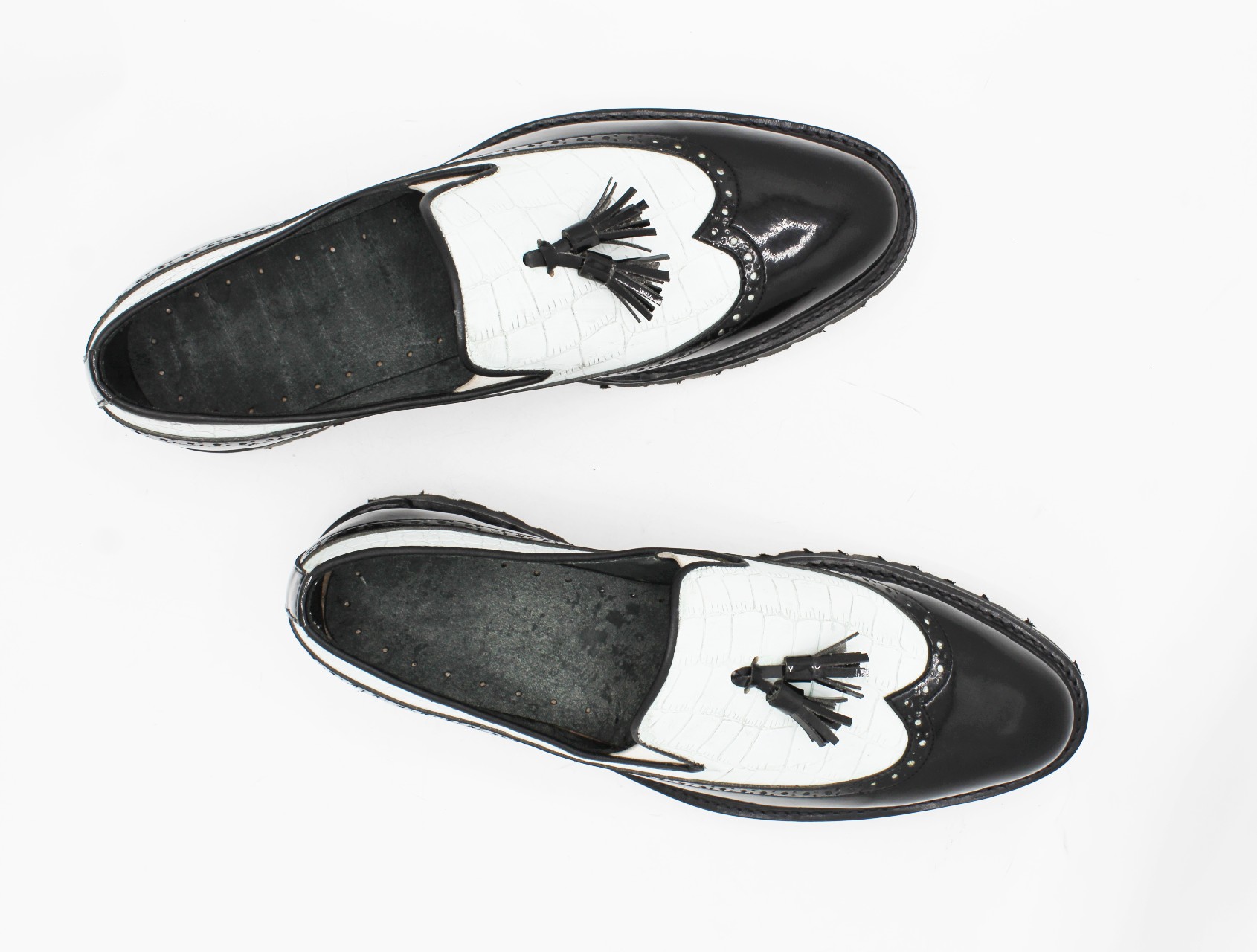 Unique Black Patent and White Crocodile Contrast Tassel Loafers Men Wingtip Dress Shoes