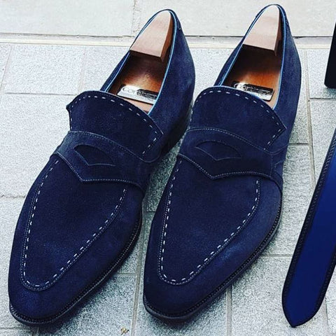 Handmade Men's Navy Suede Leather Moccasin Formal Loafers Men Shoes
