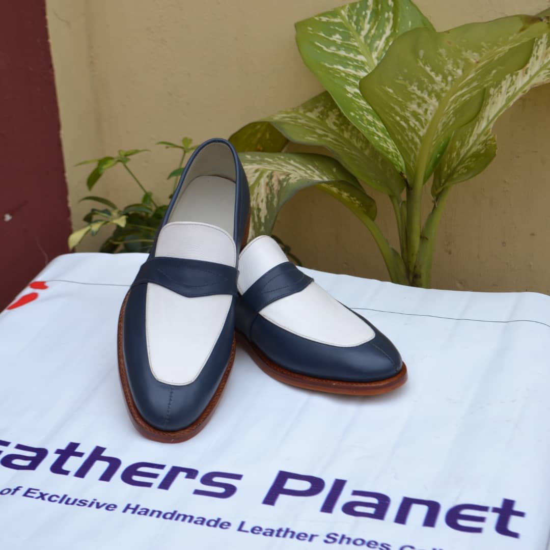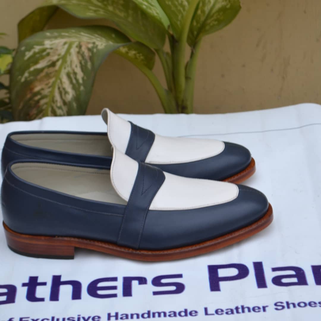Inner: Soft Sole: Leather Gender : Male Heel: Leather Color: Blue White Style: Loafers Shoes Lining Soft Calf Leather Lining Totally Hand stitched Manufacturing time 7-10 business days If you can’t find your Size/Color just send us message we will make for you.