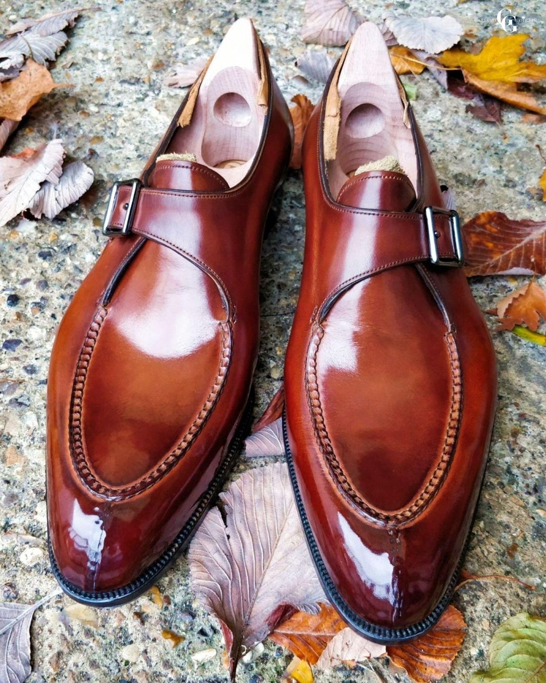 Inner: Soft Sole: Leather Gender : Male Heel: Leather Color: Brown Patina Style: Monk Strap Shoes Totally Hand stitched Manufacturing time 7-10 business days If you can’t find your Size/Color just send us message we will make for you.