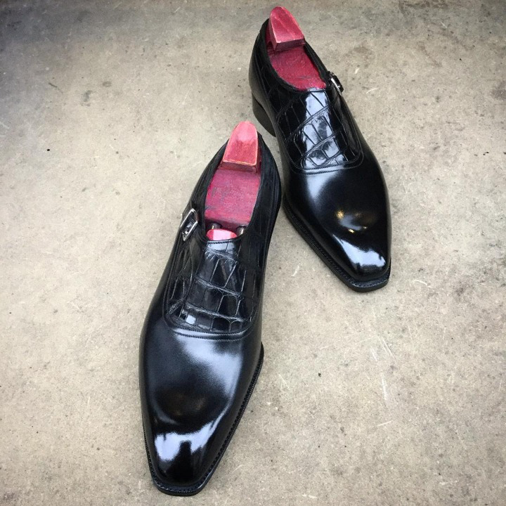 Luxury Black Calf and Black Alligator Crocodile Texture Monk Strap Dress Shoes