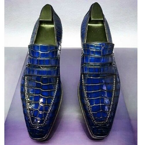 Handmade Men's Blue Crocodile Texture Embossed Leather Moccasins Shoes