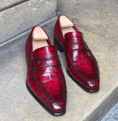 Handmade Men's Red Moccasin Crocodile Texture Leather Dress Formal Shoes