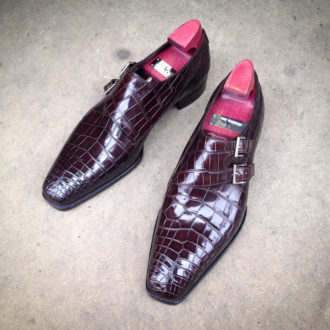 Handmade Brown Double Monk Crocodile Texture Leather Dress Shoes