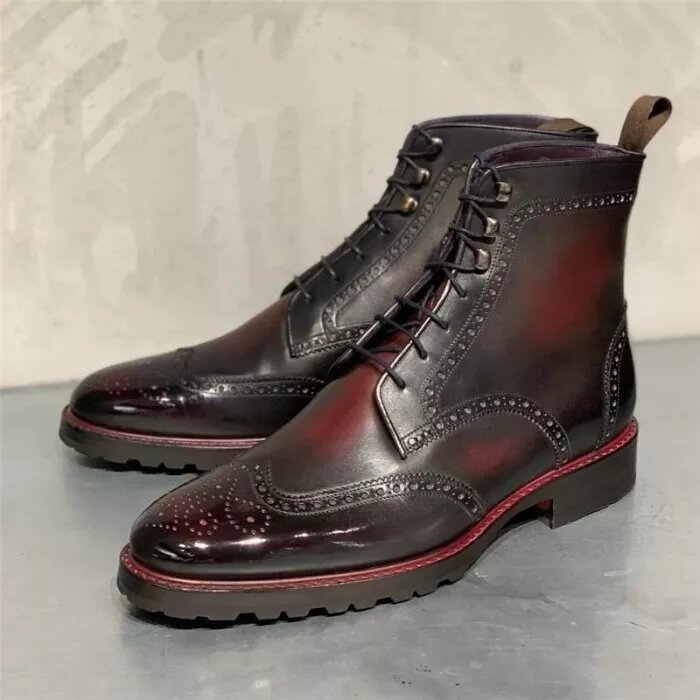 Inner: Soft Sole: Leather Gender : Male Heel: Leather Color: Red Black Style: Ankle High Toe-Shape: Rounded Toe Closure: strong> Lace Up Totally Hand stitched Manufacturing time 7-10 business days If you can’t find your Size/Color just send us message we will make for you.