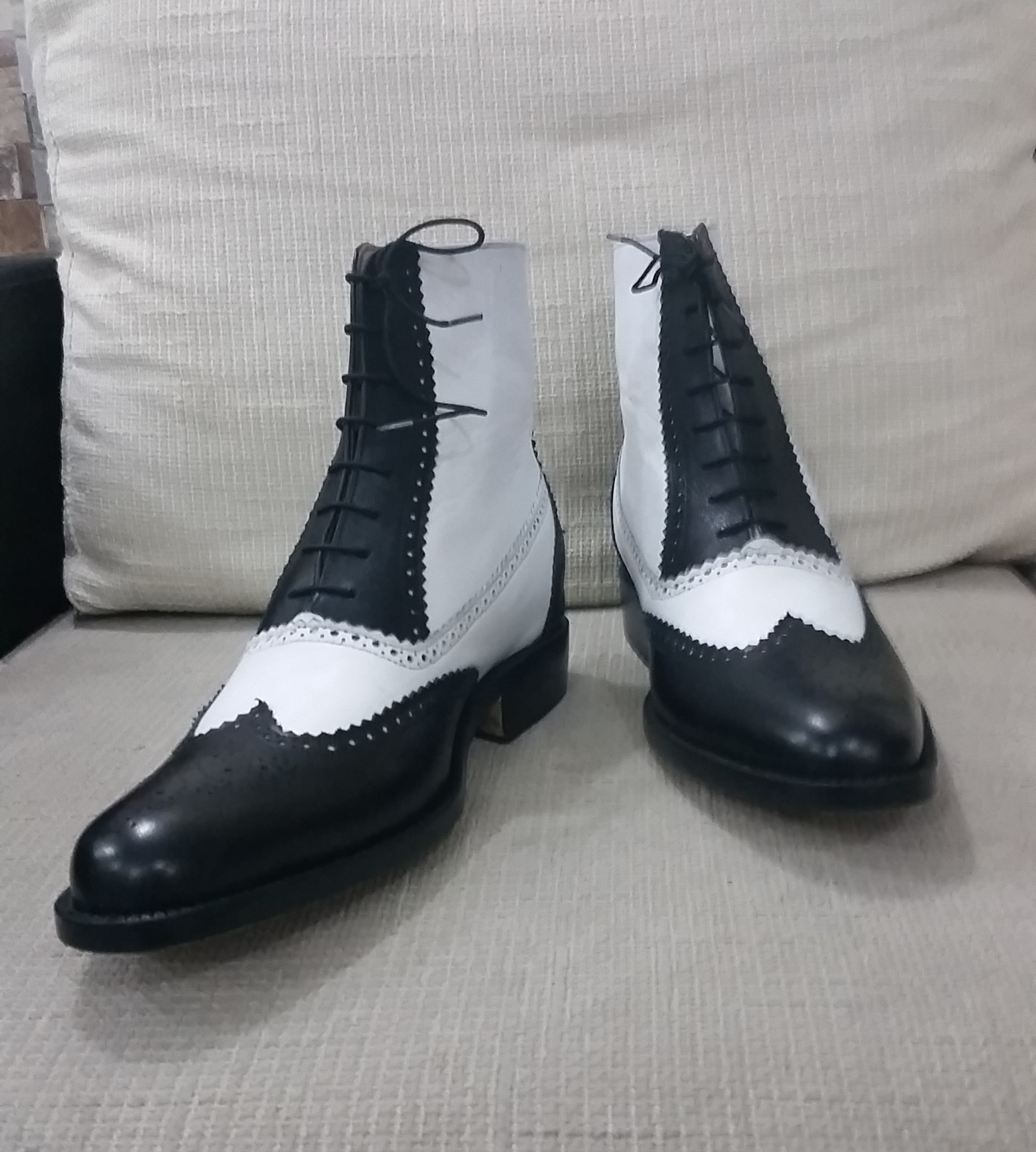 Inner: Soft Sole: Leather Gender : Male Heel: Leather Color: Black / White Style: Ankle Boot Lining Soft Calf Leather Lining Totally Hand stitched Manufacturing time 7-10 business days If you can’t find your Size/Color just send us message we will make for you.